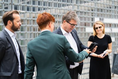 Bildungsminister Polaschek und OeAD-Geschäftsführer Calice haben am 22. August 2024 an historischen Orten im zweiten Wiener Gemeindebezirk die IWalk-App gemeinsam mit Expertinnen und Experten vorgestellt und einzelne Stationen unmittelbar erkundet.